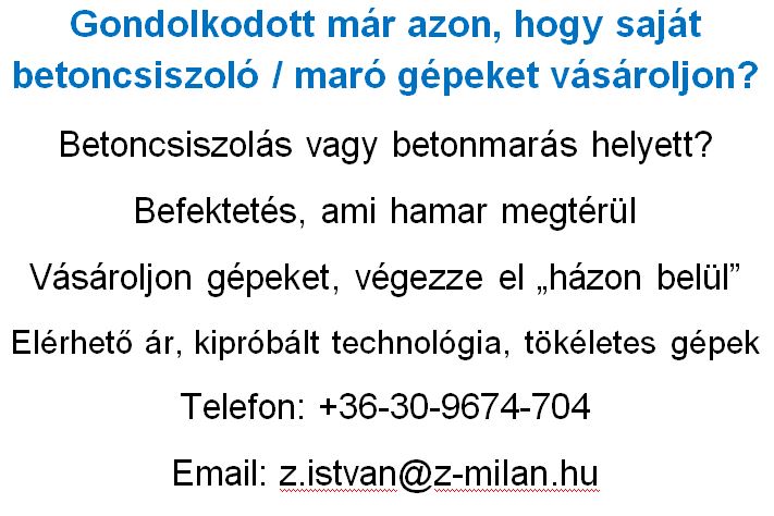 Üdvözöljük a Z-MILAN '92 Kft. oldalán! Cégünk a betonfelületek professzionális csiszolására, javítására, felújítására és marására specializálódott, lakossági és ipari környezetben egyaránt.